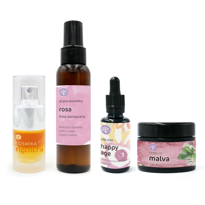 Ingredienti SIERO KOSMIKA RIGENERA: Olio di semi di girasole, acqua aromatica di rosa damascena, miele, oleolito di bacche di rosa canina, gemmoderivati di melo, lillà, ciliegio, cotogno, nespolo, cisto, olivello spinoso, ribes nero, rosa canina, olio essenziale di melissa, rimedio floreale di fanciullaccia.