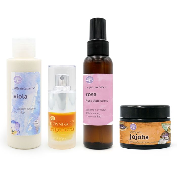 Ingredienti SIERO KOSMIKA RIGENERA: Olio di semi di girasole, acqua aromatica di rosa damascena, miele, oleolito di bacche di rosa canina, gemmoderivati di melo, lillĆ , ciliegio, cotogno, nespolo, cisto, olivello spinoso, ribes nero, rosa canina, olio essenziale di melissa, rimedio floreale di fanciullaccia.