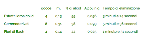 Da questo esempio si vede che si tratta di quantità di alcol insignificanti. Il tempo di eliminazione non cambia per persone con peso diverso, visto che è legato al peso corporeo così come il dosaggio dei prodotti. Spesso l’alcol nascosto in alimenti come frutta ecc. è ben più alto. Per esempio una mezza banana matura può contenere fino a 1 g di alcol, una quantità 10 volte superiore di quella che si assume con i gemmoderivati. Va però detto che i prodotti a base di alcol devono essere evitati da persone che hanno avuto problemi di dipendenza da alcol. Nei bambini fino a 3-4 anni consigliamo di diluire anche i Rimedi floreali in un po’ di acqua per non abituarli al sapore dell’alcol.