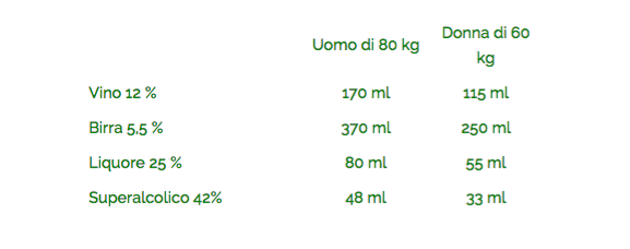 Per stabilire quale potrebbe essere la quantità giusta o tollerabile di consumo quotidiano bisogna guardare la questione principalmente dal punto di vista del fegato. Smaltire l’alcol è un lavoro “extra” per il fegato. Perciò ci potremmo chiedere quale sia la quantità di lavoro extra che possiamo chiedere al fegato senza appesantirlo troppo, godendo comunque i vantaggi di un buon bicchiere. Naturalmente in questo vanno considerati anche tutti gli altri lavori straordinari che chiediamo al fegato: fritti, eccesso di cibo, conservanti e altri additivi, medicinali, caffé, arrabbiature, per citarne solo alcuni. Potrebbe essere ragionevole per un fegato non particolarmente stressato chiedere due ore di lavoro extra per smaltire l’alcol. In due ore il fegato riesce a smaltire 16 g di alcol in un uomo di 80 kg e 10,8 g in una donna di 60 kg corrispondenti a:
