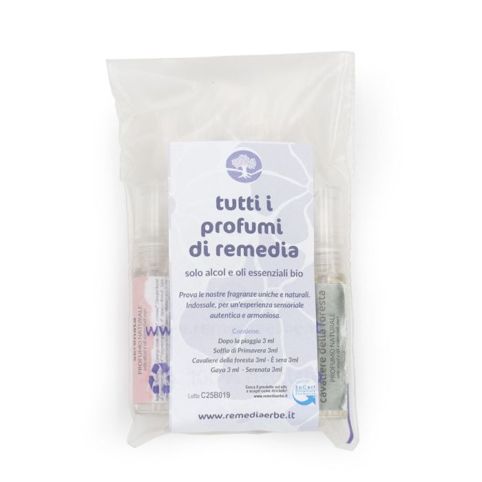 Abbiamo riunito in un unico prodotto i sei profumi per la persona di Remedia. questo ti darà la possibilità di indossarli in base al tuo umore, oppure di provarli, se non li hai mai sentiti.
